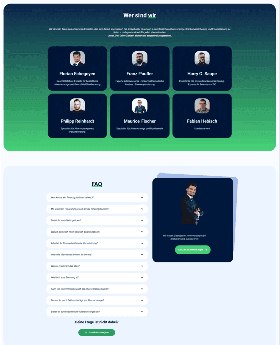 Zentrale Dienstleistungen wie „Altersvorsorgeberatung“ und „PKV“ wurden prominent und übersichtlich eingebunden, sodass Interessenten direkt zu den für sie relevanten Angeboten geführt werden. Zudem sorgt eine optimierte mobile Ansicht dafür, dass die Webseite sowohl auf Desktops als auch auf mobilen Endgeräten einwandfrei funktioniert.