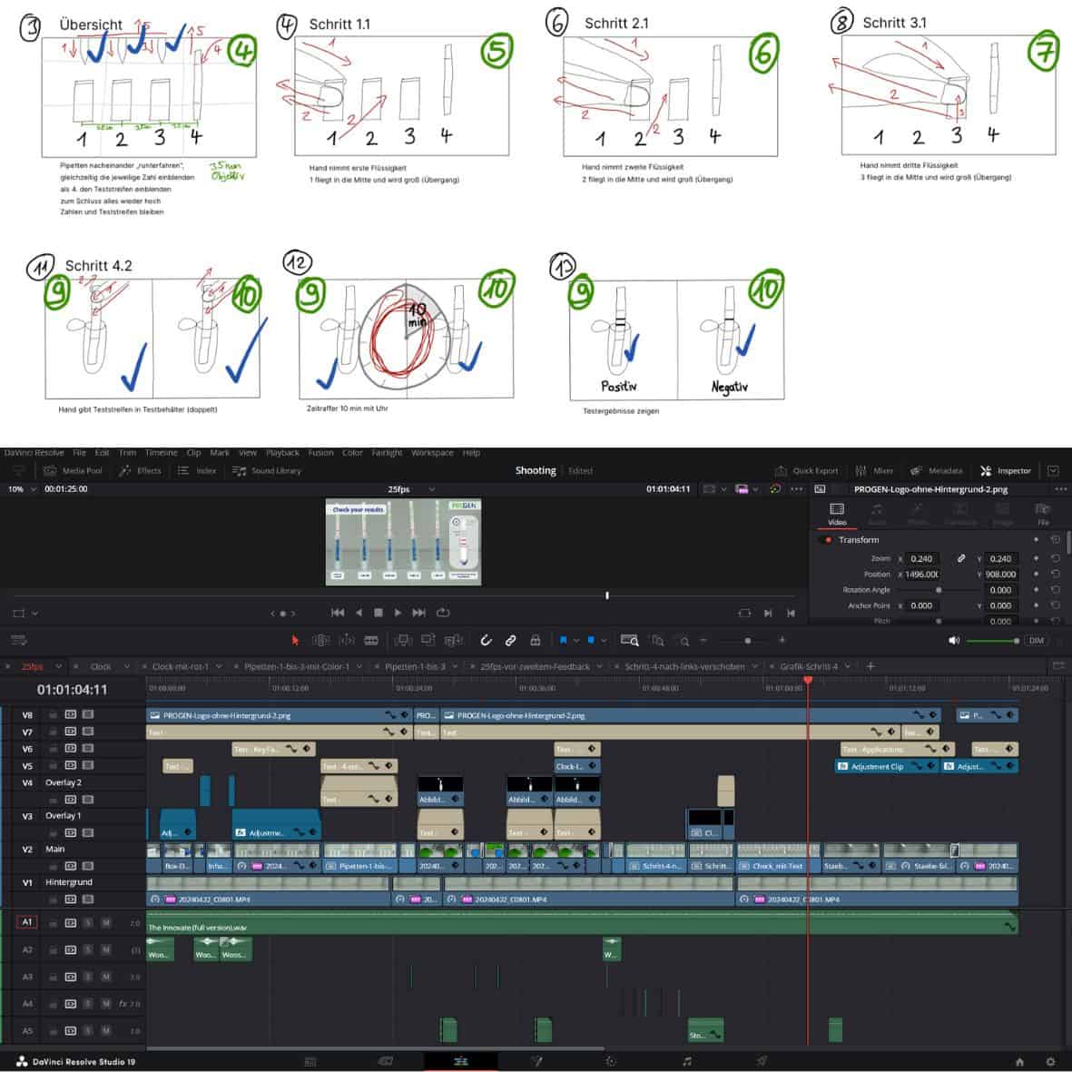 Damit das Fachpublikum auf der Messe überzeugt werden konnte, bedurfte es einer wissenschaftlich exakten und korrekten Darstellung des Versuchs. Ein durchdachtes Storyboard, um das zu erreichen. Aus schnellen Skizzen zur Besprechung vor dem Dreh wurden präzise und optisch ansprechende Szenen im Video. Das Beispiel nebendran zeigt – erst als Skizze, dann als fertiges Video – eine Hand, die sich eines der aufgestellten Fläschchen nimmt und die Flüssigkeit daraus dann in das Versuchsgefäß tropft. Durch diese akribische Planung und Vorbereitung jeder einzelnen Szene überzeugte PROGEN durch das Video selbst die größten Kritiker auf der Messe.